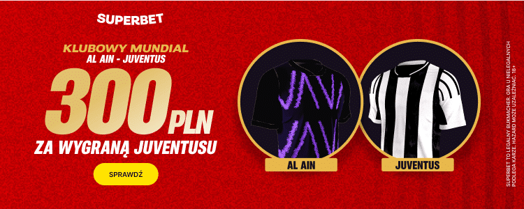 Przy okazji możesz skorzystać ze specjalnej oferty Superbet, która jest skierowana do osób, które zarejestrują konto z kodem promocyjnym GOAL. Będziesz mógł bowiem zgarnąć extra bonus 300 zł za trafiony typ na wygraną Juventusu. Wszystko co musisz zrobić po rejestracji konta z kodem GOAL to dokonanie pierwszej wpłaty w wysokości min. 50 zł oraz postawienie już za 2 zł pojedynczego zakładu na wygraną Juventusu w meczu z Al-Ain.