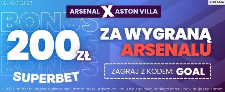 Arsenal jest faworytem meczu z Aston Villą, a w Superbet można przy jego okazji skorzystać z bardzo ciekawej promocji. Pozwala ona zagrać zakład na wygraną Arsenalu po kursie 100 i zgarnąć dzięki temu bonus 200 zł. Co trzeba zrobić?