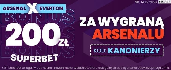 W Superbet możesz przy okazji tego meczu skorzystać ze specjalnej oferty i postawić zakład na zwycięstwo Arsenalu po kursie 100. Stawiając tylko 2 zł można zgarnąć 200 zł. Co trzeba zrobić?