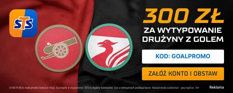Świetną promocję na niedzielny hit Premier League przygotował bukmacher STS. Pozwala na zagranie zakładu na gola Arsenalu lub Liverpoolu po kursie 150. Stawiając tylko 2 zł można zgarnąć bonus o wartości 300 zł. Do skorzystania z oferty uprawnia podanie kodu GOALPROMO podczas rejestracji. Poniżej wyjaśniamy zasady promocji.
