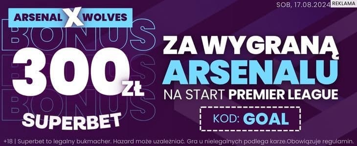 Superbet oferuje nowym klientom możliwość postawienia zakładu na wygraną Arsenalu w meczu z Wolverhampton po kursie 150. Dzięki temu można zgarnąć aż 300 zł bonusu. Jak to zrobić?