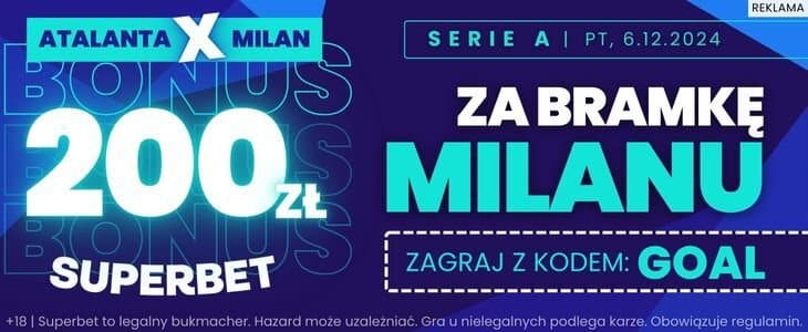 W Superbet można skorzystać z oferty, dzięki której można zgarnąć 200 zł bonusu za wytypowanie gola Milanu w meczu z Atalantą. Do skorzystania z oferty uprawnia kod promocyjny GOAL, który należy podać podczas rejestracji. Poniżej wyjaśniamy krok po kroku jak skorzystać z oferty.