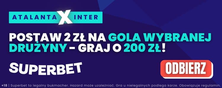 Na niedzielny hit Serie A Superbet przygotował ofertę, dzięki której możesz postawić zakład na choćby jednego gola wybranej przez siebie drużyny po kursie 100.00. Typując za zaledwie 2 zł gola dla Atalanty lub Interu, możesz zgarnąć bonus 200 zł. Poniżej wyjaśniamy jak skorzystać z tej promocji.