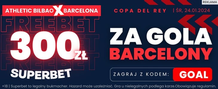 - Postaw pierwszy zakład SOLO po założeniu konta, na którym znajduje się typ na gola Barcelony w meczu z Athletic Bilbao w regulaminowym czasie gry (wydarzenie odbędzie się w dniu 24.01.2024)