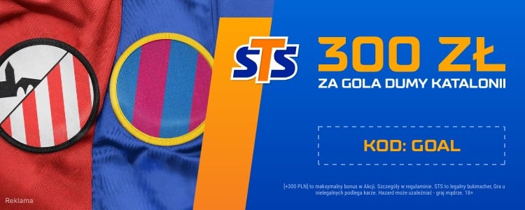 Rejestrując konto w STS z kodem promocyjnym GOAL (wyrażając przy tym zgody marketingowe) otrzymasz nie tylko możliwość obejrzenia meczu, ale również skorzystania z promocji pozwalającej zagrać zakład na gola jednej z drużyn po kursie 150.00. Aby skorzystać z tej oferty należy dokonać pierwszego depozytu w kwocie minimum 50 zł oraz zagrać za co najmniej 2 zł pojedynczy zakład na bramkę Athletic Bilbao lub Barcelony. Jeżeli kupon okaże się trafiony, otrzymasz wygraną oraz dodatkowo bonus w wysokości 300 zł.