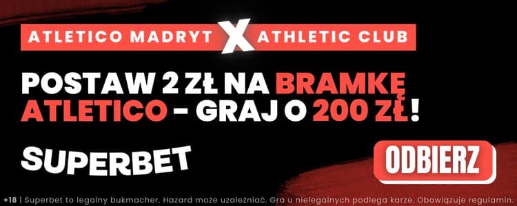 Superbet przygotował ofertę dzięki której zakład na choćby jednego gola Atletico Madryt w sobotnim meczu można postawić po kursie 100. Dzięki niej można zgarnąć bonus 200 zł stawiając kupon za zaledwie 2 zł. Co trzeba zrobić?