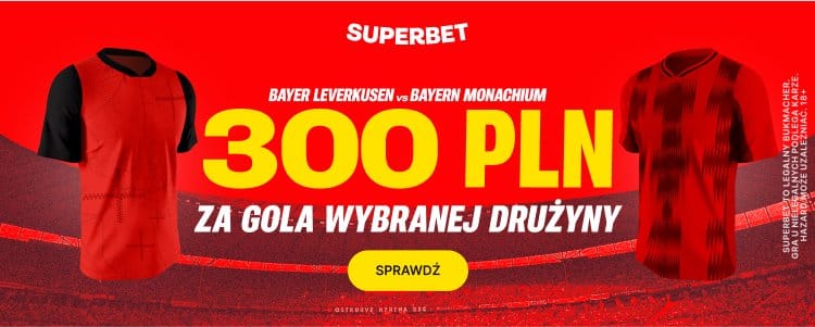 Superbet przygotował bardzo atrakcyjną ofertę na sobotni hit Ekstraklasy. Stawiając tylko 2 zł na gola Bayeru lub Bayernu możesz otrzymać aż 300 zł bonusu. Wystarczy spełnić proste warunki oferty. Prezentujemy je krok po kroku poniżej.