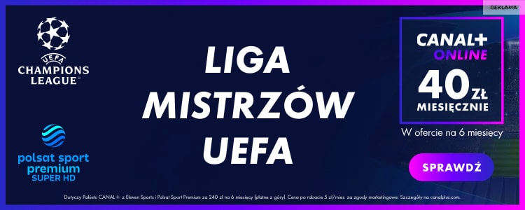 Za pośrednictwem internetu środowy hit Ligi Mistrzów będzie można obejrzeć w usłudze CANAL+ online. Jeszcze tylko dzisiaj (20 września) można skorzystać ze świetnej promocji i dostęp na 6 miesięcy do wszystkich kanałów CANAL+, Polsat Sport Premium i Eleven Sports uzyskać w cenie 40 zł miesięcznie (240 zł za cały okres). To oszczędność aż 204 zł względem standardowej oferty. Z promocji można skorzystać rejestrując konto za pośrednictwem naszej strony.