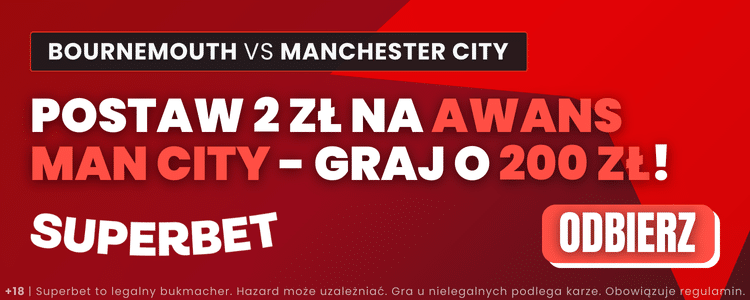 Manchester City do niedzielnego spotkania przystąpi w roli wyraźnego faworyta. Dlatego warto zwrócić uwagę na ofertę Superbet, który daje możliwość postawienia zakładu na awans Manchesteru City po kursie 100. Wystarczy spełnić proste warunki oferty, które prezentujemy poniżej.