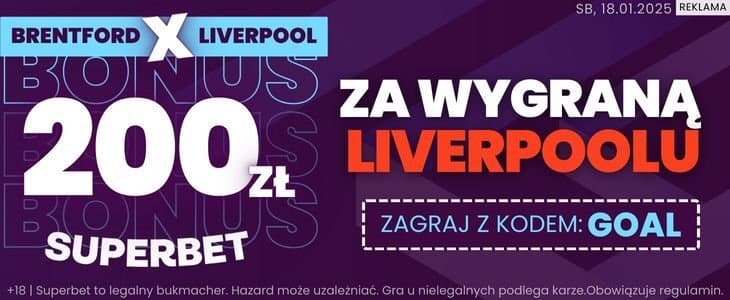 Superbet przygotował na to spotkanie specjalną promocję, dzięki której zakład na zwycięstwo Liverpoolu nad Brentfordem można postawić po kursie 100.00. Dzięki tej ofercie możesz zgarnąć 200 zł bonusu. Jak skorzystać z opisywanej promocji?
