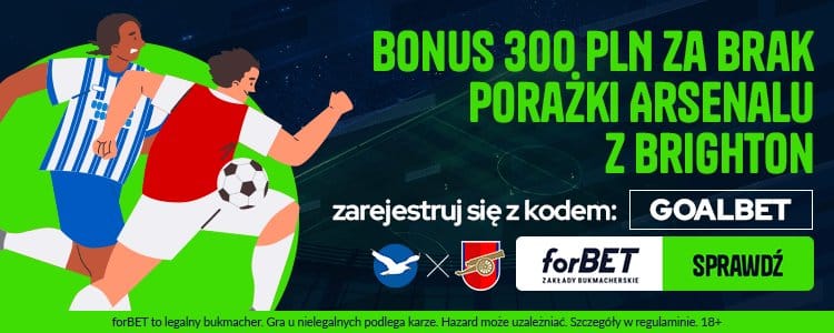 Specjalną ofertę na sobotnie spotkanie przygotował bukmacher forBET. Oferuje bowiem aż 300 zł bonusu za typ na to, że Arsenal nie przegra z Brighton. Co trzeba zrobić, aby zgarnąć taką kwotę? Wyjaśniamy.