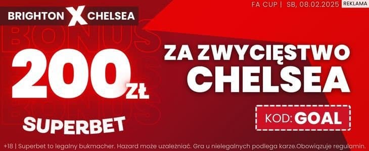 Przy okazji sobotniego meczu Chelsea w Pucharze Anglii można skorzystać z atrakcyjnej promocji Superbet. Bukmacher oferuje możliwość zagrania zakładu na wygraną Chelsea po kursie 100. Jak zgarnąć dzięki temu bonus 200 zł?