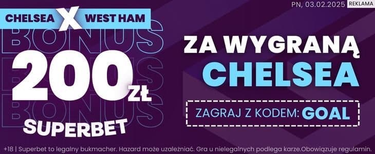 Superbet przygotował ofertę dzięki której zakład na zwycięstwo Chelsea w poniedziałkowym meczu z West Hamem można postawić po kursie 100. Do zgarnięcia jest bonus 200 zł. Co trzeba zrobić?