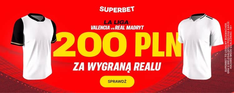 W Superbet możesz skorzystać przy okazji piątkowego meczu z promocji, dzięki której zakład na wygraną Realu postawisz po kursie 100. Dzięki tej ofercie można zgarnąć bonus 200 zł. Poniżej wyjaśniamy zasady.