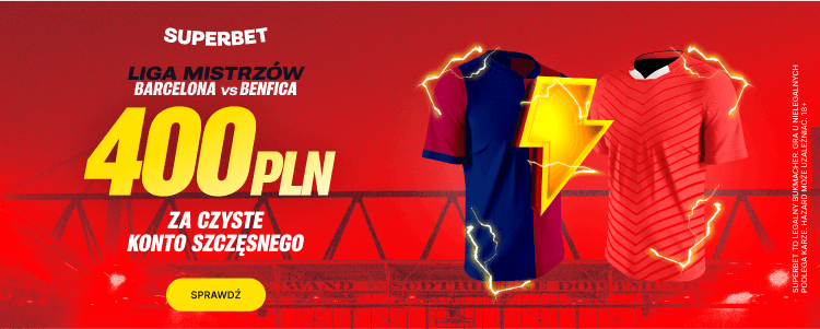 - Postaw pierwszy zakład pojedynczy za min. 2 zł na czyste konto Szczęsnego w meczu Barcelona – Benfica (zakład zaliczany do promocji SUPER BOOST – Wojciech Szczęsny zachowa czyste konto (było 2.70).)
