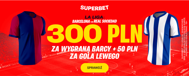 Niezwykle atrakcyjną promocję przygotował na niedzielne spotkanie Barcelony Superbet. Bukmacher oferuje możliwość zagrania zakładu na zwycięstwo Barcy po kursie 150 i zgarnięcie dzięki temu 300 zł bonusu. Dodatkowo dorzuci 50 zł za każdego gola zdobytego przez Lewandowskiego. Poniżej wyjaśniamy jak skorzystać z tej oferty.