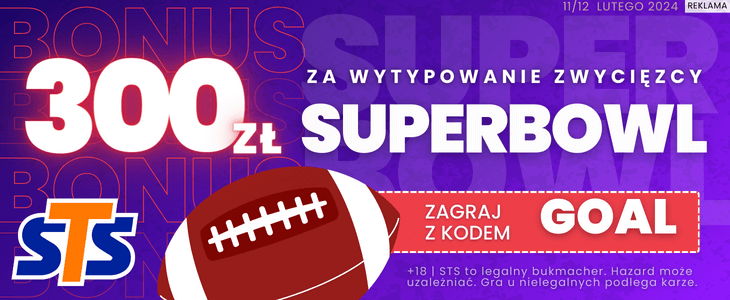 STS przygotował promocję na Super Bowl, w której do zyskania jest aż 300 zł bonusu! Z oferty mogą skorzystać nowi klienci, którzy założą konto w STS podając kod promocyjny GOAL, wyrażą zgodę na komunikację marketingową, a następnie dokonają depozytu na kwotę min. 50 zł. Po spełnieniu tych warunków należy postawić pierwszy zakład SOLO lub AKO z oferty przedmeczowej zawierający typ na zwycięzcę finału Super Bowl. Minimalna stawka kuponu kwalifikującego do promocji to 2 zł. Jeśli zakład będzie wygrany to STS przyzna bonus 300 zł. Co ważne, akcja łączy się z zakładem bez ryzyka do 100 zł, który również jest dostępny z naszym kodem promocyjnym. Szczegółowy regulamin promocji jest dostępny na stronie bukmachera.