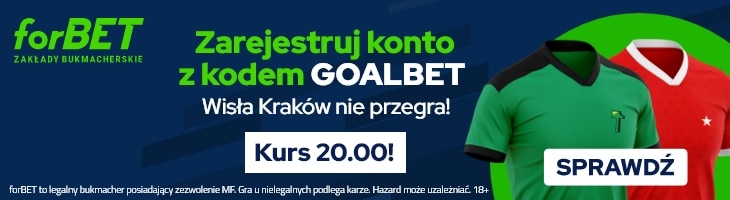 Bukmacher forBET specjalnie dla Czytelników goal.pl przygotował świetną promocję, która pozwala zagrać zakład X2 (Wisła nie przegra) po świetnym kursie 20.00. Do skorzystania z tej promocji uprawnia podanie kodu promocyjnego GOALBET w trakcie rejestracji. Poniżej wyjaśniamy jak skorzystać z oferty.