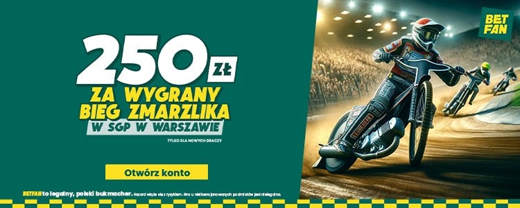Świetną promocję na Grand Prix Polski przygotował BETFAN. Jeżeli założysz konto z kodem promocyjnym GOAL będziesz mógł skorzystać z oferty pozwalającej na odebranie freebetu w wysokości aż 250 zł za wygranie przez Bartosza Zmarzlika choćby jednego biegu. Poniżej krok po kroku wyjaśniamy jak skorzystać z oferty.