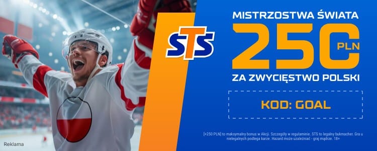 Przy okazji Mistrzostwa Świata w hokeja warto zwrócić uwagę na ofertę STS. Jeżeli założyć konto z kodem promocyjnym GOAL, będziesz miał szansę na zgarnięcie bonusu 250 zł za wytypowanie wygranej Polski w dowolnym meczu na turnieju. Poniżej wyjaśniamy jak skorzystać z oferty.