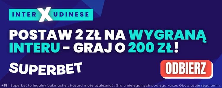 - Zagraj za min. 2 zł pierwszy zakład pojedynczy na zwycięstwo Interu w meczu z Udinese