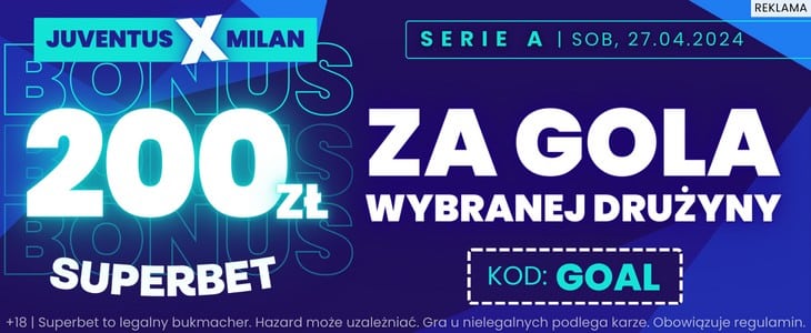 Przy okazji tego meczu warto również zwrócić uwagę na ofertę przygotowaną przez Superbet. Bukmacher osobom, które zarejestrują konto z kodem promocyjnym GOAL oferuje bonus 200 zł za wytypowanie drużyny, która zdobędzie gola.
