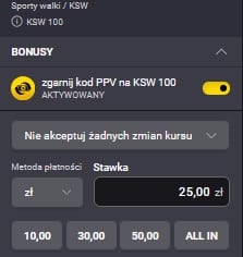 - Postaw pierwszy zakład za 25 zł na KSW 100 – mają się na nim znaleźć 2 wydarzenia, a minimalny łączny kurs to 2.00.