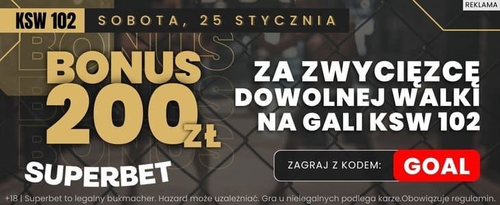 Superbet przygotował bardzo atrakcyjną promocję na galę KSW 102. Oferuje bowiem możliwość postawienia zakładu na zwycięzcę dowolnej walki po kursie 100. Dzięki tej ofercie stawiając tylko 2 zł można zgarnąć bonus 200 zł. Poniżej wyjaśniamy jak skorzystać z oferty.