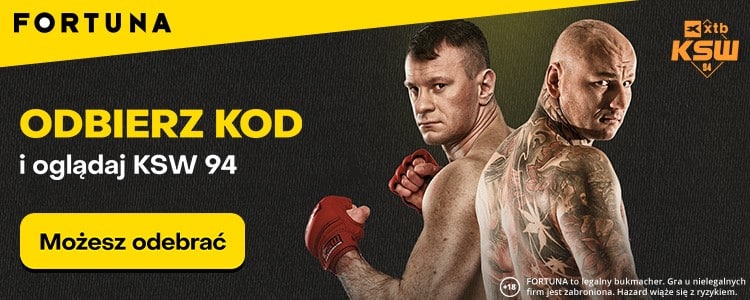 Transmisja sobotniej gali KSW 94 dostępna będzie tylko za pośrednictwem platformy Viaplay. Teraz możesz skorzystać ze świetnej oferty i odebrać w Fortunie kod do Viaplay za jedyne 10 zł. Kod uprawnia do uzyskania miesięcznego dostępu. Z promocji możesz skorzystać rejestrując konto w Fortunie za pośrednictwem naszej strony. Poniżej wyjaśniamy co trzeba zrobić.