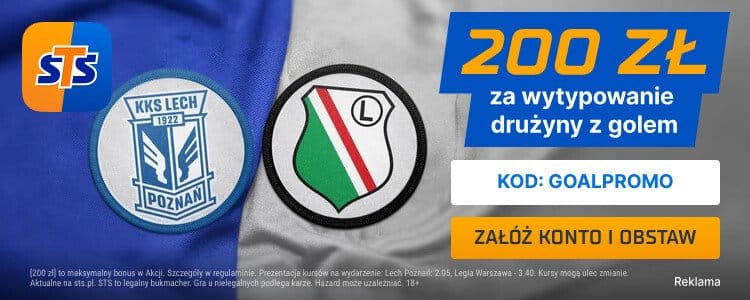STS przygotował specjalną promocję na niedzielny mecz Lech Poznań – Legia Warszawa. Dzięki niej można postawić zakład na gola gospodarzy lub gości po bardzo wysokim kursie 100.00. Grając taki kupon za 2 zł, do zgarnięcia jest aż 200 zł. Do skorzystania z promocji uprawnia podanie kodu GOALPROMO podczas rejestracji. Poniżej wyjaśniamy zasady.
