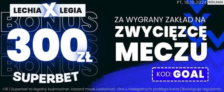Rozważając typ na piątkowe spotkanie warto zwrócić uwagę na ofertę Superbet, który oferuje możliwość zagrania zakładu na zwycięstwo Lechii lub Legii po kursie 150. Dzięki tej ofercie można zgarnąć bonus 300 zł. Poniżej wyjaśniamy krok po kroku co trzeba zrobić.