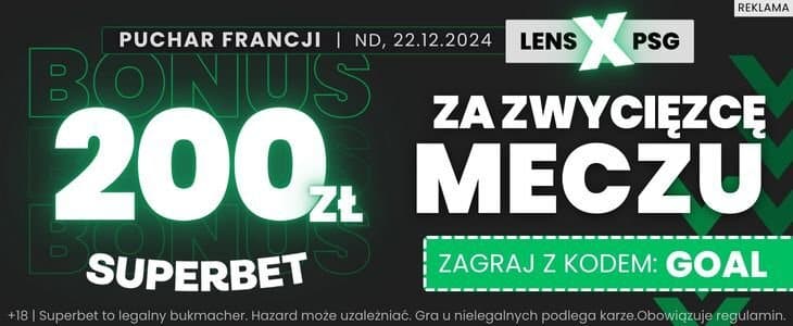 Mecz pomiędzy Lens a PSG nie będzie też transmitowane na żadnej platformie streamingowej, gdyż w Polsce żadna nie posiada praw do transmisji meczów Pucharu Francji. Jest jednak inna opcja na obejrzenie spotkania. Transmisja dostępna będzie za darmo w usłudze Superbet TV. Aby uzyskać do niej dostęp wystarczy zarejestrować konto w Superbet z kodem promocyjnym GOAL.