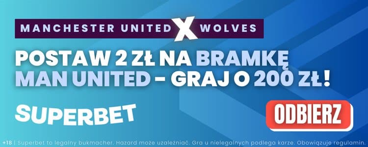 - Postaw pierwszy po założeniu konta zakład pojedynczy za 2 zł typując gola Manchesteru United w meczu z Wolverhampton Wanderers,
