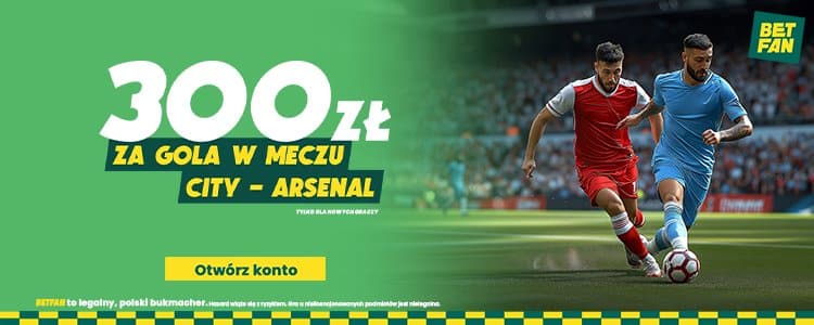 W BETFAN możesz teraz skorzystać ze świetnej promocji i zgarnąć extra 300 zł, jeżeli w meczu Manchesteru City z Arsenalem padnie choćby jedna bramka. Do skorzystania z oferty uprawnia podanie podczas rejestracji w BETFAN kodu promocyjnego GOAL.