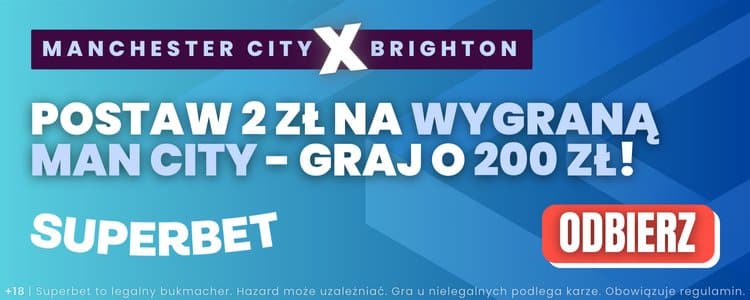 - Zagraj za min. 2 zł pierwszy zakład pojedynczy na zwycięstwo Manchesteru City w meczu z Brighton