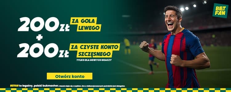 Po 200 zł bonusu (łącznie aż 400 zł) można zgarnąć korzystając z oferty BETFAN. Bukmacher oferuje takie bonusy za gola Lewandowskiego i czyste konto Szczęsnego w poniedziałkowym meczu z Rayo. Poniżej krok po kroku wyjaśniamy co trzeba zrobić, aby skorzystać z oferty.