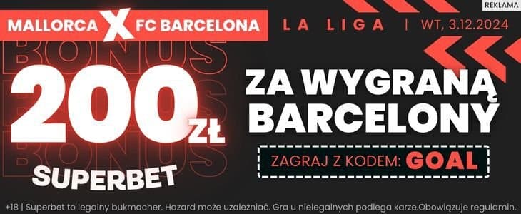 Przy okazji wtorkowego spotkania można zwrócić uwagę na ofertę Superbet, która daje możliwość zgarnięcia extra bonusu 200 zł za wytypowanie zwycięstwo Barcelony. Do skorzystania z oferty uprawnia kod GOAL, który należy podczas podczas rejestracji. Więcej szczegółów na stronie oferty.