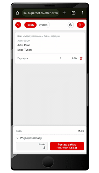 - Postaw pierwszy po założeniu konta kupon pojedynczy, na którym znajdzie się typ na wygraną Tysona w walce z Paulem (jak na poniższym screenie)