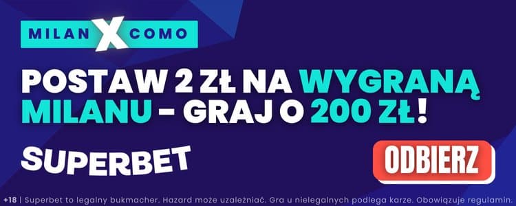 Superbet przygotował dla nowych klientów ofertę dzięki której stawiając zaledwie 2 zł na wygraną Milanu można zgarnąć aż 200 zł bonusu. Z oferty można skorzystać zakładając konto z kodem promocyjnym GOAL. Poniżej wyjaśniamy krok po kroku jakie warunki trzeba spełnić.
