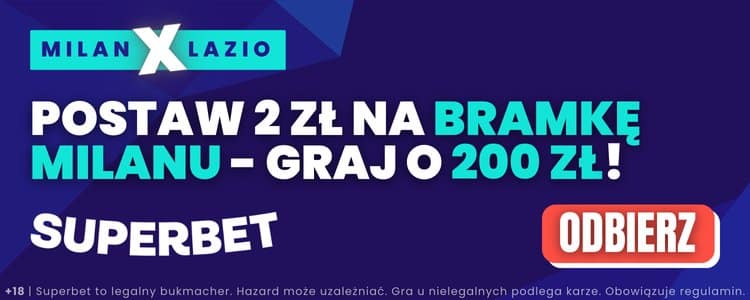 Atrakcyjną ofertę na niedzielne spotkanie przygotował bukmacher Superbet. Nowi klienci mogą zgarnąć aż 200 zł bonusu typując za 2 zł gola dla Milanu. Zasady oferty są bardzo proste. Poniżej wyjaśniamy jak z niej skorzystać.