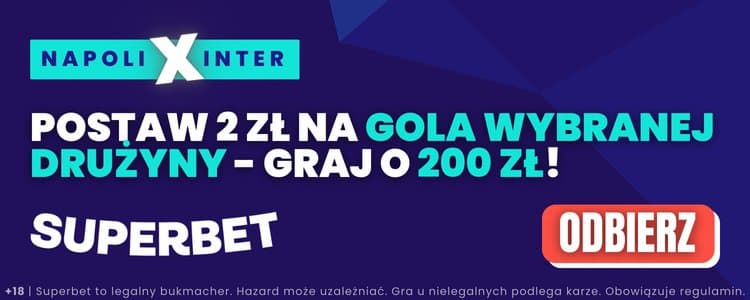 Aż 200 zł dodatkowego bonusu można zgarnąć w Superbet stawiając za zaledwie 2 zł zakład na gola wybranej drużyny w meczu Napoli – Inter. Z oferty można skorzystać spełniając poniższe warunki.