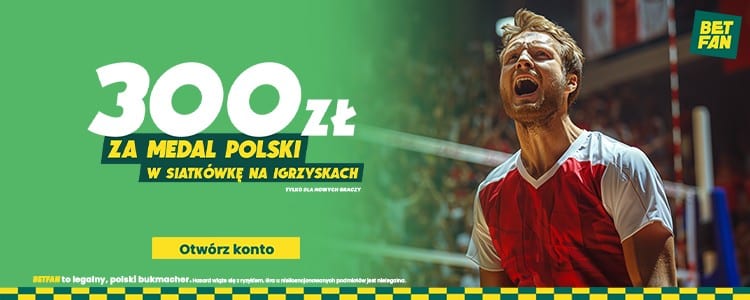 Bardzo ciekawą promocję przygotował bukmacher BETFAN. Oferuje bowiem aż 300 zł bonusu, jeżeli siatkarze reprezentacji Polski wywalczą jakikolwiek medal na Igrzyskach Olimpijskich. Poniżej wyjaśniamy co trzeba zrobić, aby skorzystać z oferty.