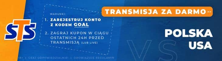 Za pośrednictwem internetu mecz Polska – USA obejrzysz między innymi w usłudze z STS TV. Powyżej wyjaśniliśmy jak uzyskać dostęp do bezpłatnej transmisji. Mecz będzie również dostępny na internetowej stronie tvpsport.pl oraz w usłudze Polsat Box Go.