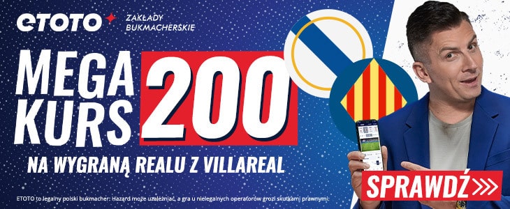 - Postaw 1 zł na zwycięstwo Realu Madryt nad Villarrealem. Podwyższony kurs znajdziesz na stronie promocji.