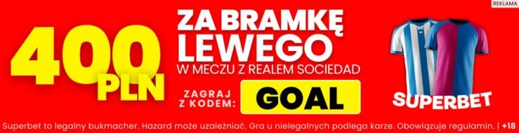 - Jeżeli Lewandowski zdobędzie gola, otrzymasz od Superbet bonus o wartości 400 zł