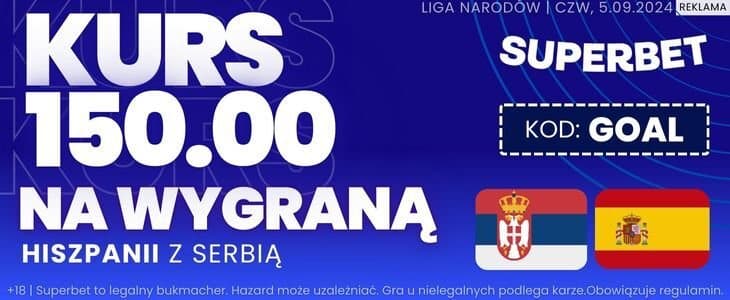 Superbet przygotował na czwartkowe spotkanie specjalną ofertę. Oferuje możliwość zagrania zakładu na wygraną Hiszpanii po kursie 150.00. Stawiając zaledwie 2 zł można zgarnąć bonus o wartości 300 zł. Z oferty można skorzystać rejestrując konto w Superbet z kodem promocyjnym GOAL. Jak skorzystać z oferty? Wyjaśniamy!