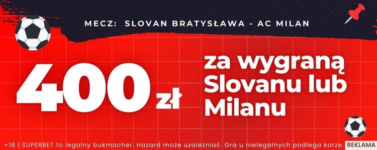 Bonus 400 zł za typ na zwycięzcę meczu Slovan – Milan