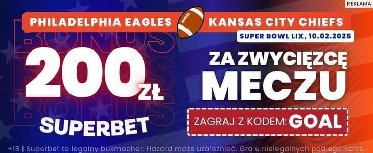 - Postaw za minimum 2 zł pierwszy po założeniu konta zakład pojedynczy na zwycięzcę meczu o Super Bowl 2025