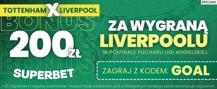 Superbet przygotował na środowy półfinał promocję, dzięki której zakład na wygraną Liverpoolu można postawić po kursie 100. Stawiając tylko 2 zł można zgarnąć bonus 200 zł. Poniżej wyjaśniamy krok po kroku jak skorzystać z oferty.