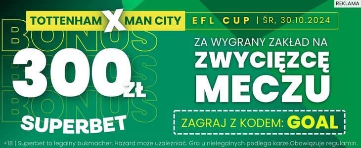 W Superbet możesz skorzystać z promocji i zgarnąć dodatkowe 300 zł. Wystarczy zagrać za 2 zł zakład na zwycięstwo Tottenhamu lub Man City w podstawowym czasie gry. Do skorzystania z oferty uprawnia podanie kodu GOAL podczas rejestracji. Wyjaśniamy krok po kroku co trzeba zrobić.